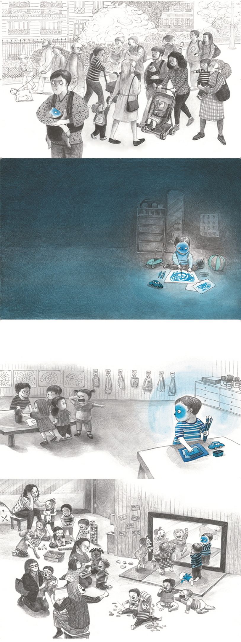 2014 볼로냐 올해의 일러스트레이터 이소영 작가의 『파란 아이 이안』. 얼굴 전체를 뒤덮은 파란 점을 가지고 태어난 아이 이안이의 이야기를 통해 타인에 의한 선입견이 입혀지기 전에 자신을 사랑하는 법을 먼저 가르쳐 주는 그림책이다. 이안이는 자신의 파란색을 당당히 드러내지만, 반대로 파란색에 너무 집착한 나머지 아이들 사이에서 외톨이가 되어 버린다. 파란색 물건은 모두 자기 것이라는 소유욕에 사로잡혀 아이들과 부딪히게 된 것이다. 이러한 이안이의 생각을 뒤흔드는 존재가 등장한다. 바로 빨간 머리의 롱이다. 이안이는 롱이와 함께 파란색과 빨간색을 섞으며 다양한 색이 나타나는 경험을 한다. 파란색만 고집했던 이안이가 조금씩 바뀌고 다른 색을 받아들이는 과정은 자신만의 동굴에서 나와 더 넓은 세상과 조우하게 되는 이안이의 변화를 상징한다. 저자는 이러한 이안이의 이야기를 통해 더불어 사는 세상에 대한 깨달음을 얻고, 알록달록 색들이 아름답게 어우러지는 세상으로 함께 나아가길 바라고 있다.