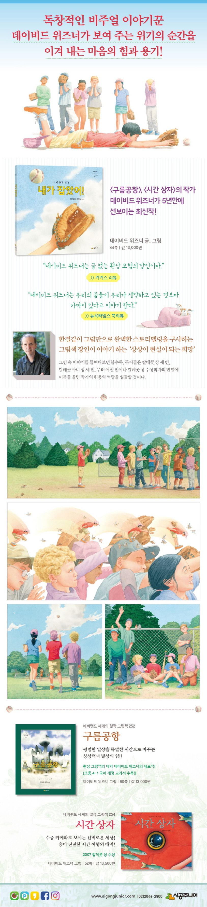 “잡다”라는 동사만으로 이야기를 끌어가는 데이비드 위즈너의 그림책 『내가 잡았어!』. “잡다”란 동사는 ‘차지하다, 얻다, 놓지 않다, 취하다’ 등의 의미를 포함하고 있는, 주어의 능동적이고 강한 의지가 담겨 있는 동사이다. 그림만으로 완벽한 스토리텔링을 구사하는 그림책 작가 데이비드 위즈너는 위기의 순간에 느끼는 마음의 불안과 공포에 대한 생각을 섬세하고 치밀한 슬로 모션으로 담아내며 마음과 생각을 보여 주는 내적인 이야기를 들려준다.