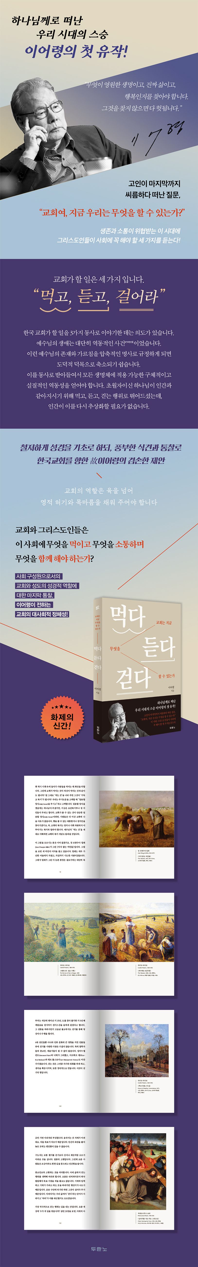 ‘먹다 듣다 걷다’ 세 주제는 결국, 현대교회가 비껴갈 수 없는 현대인의 트렌드와 욕망과도 연결되어 있기에, 교회와 성도가 사회 구성원으로서 성경적 역할을 하는 방식과 방향성을 짚어 나간다. 특히 철저하게 성경을 기초로 하되, 저자의 풍부한 식견과 통찰로 겸손한 제안을 아끼지 않는다. 교회의 문제나 불충분한 자기 역할을 비판하기보다 달라져야 하고 시도해야 하는 영역을 다루는 것이 기존의 교회 역할론과 확실한 차이점이다.