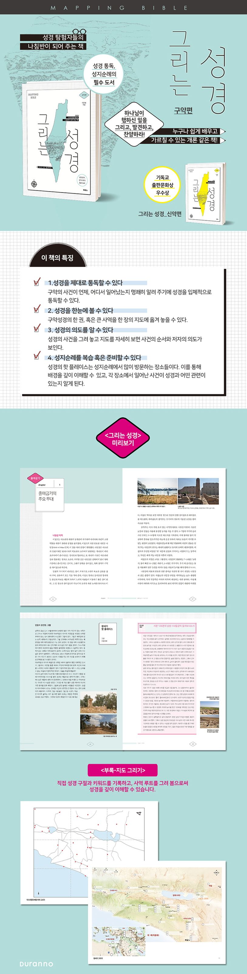 이 책은 지리와 성경을 직접 연결하는 책이다. 먼저 성경을 펴고 해당하는 말씀을 읽는다. 그후 이 책의 표를 보고 성경에 형광펜으로 해당 지역을 칠한다. 그 다음엔 지도에 성경 구절과 핵심 키워드를 쓰면 뇌리에 박혀 성경이 입체적으로 읽힌다. 그 후 완성된 지도를 보면 각 성경의 공통점과 차이점을 뚜렷이 발견할 수 있다. 이 방식대로 하다 보면 통독할 때는 발견하지 못한 보석들을 캘 수 있다. 이 책은 수요예배나 그룹별 성경공부 때 활용하기 좋다. 〈부록-지도〉에는 2번씩 그려볼 수 있도록 지도를 2장 배치했으며, OHP 필름은 2장 넣어 종이에 대고 그렸다 지웠다 할 수 있도록 했다.