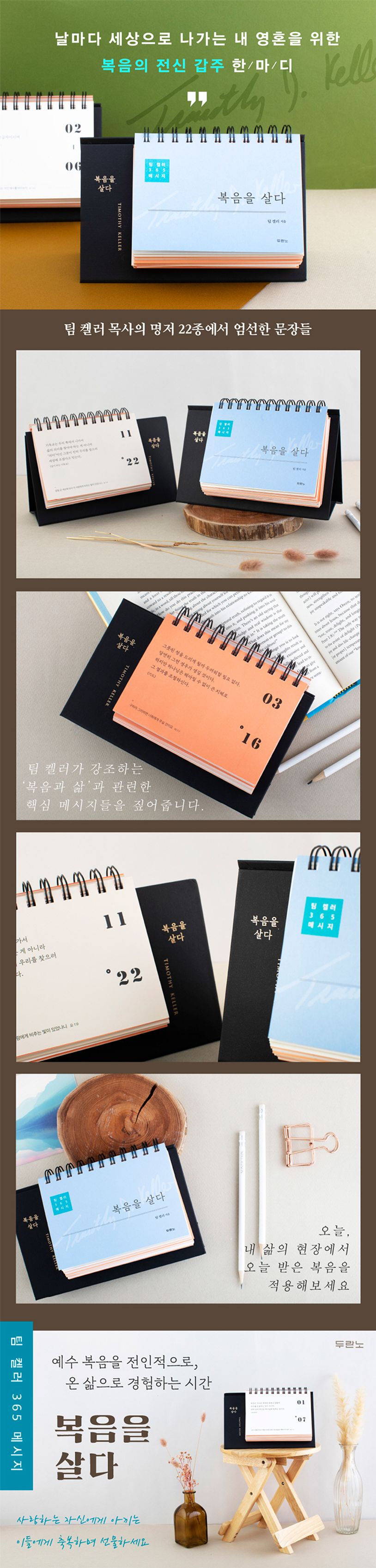 《기도》, 《일과 영성》, 《탕부 하나님》, 《내가 만든 신》 등 전 세계 독자들에게 크게 사랑받고 있는 팀 켈러 목사 명저 22권에서 365개 메시지를 선별해 탁상용 캘린더를 구성했다. “예수 복음을 되새겨 줄 문장+성경 구절”을 매일매일 먹고 소화시키라! 복음을 마음에 새기고, 예수로 사는 하루! 반드시 인생이 달라진다!