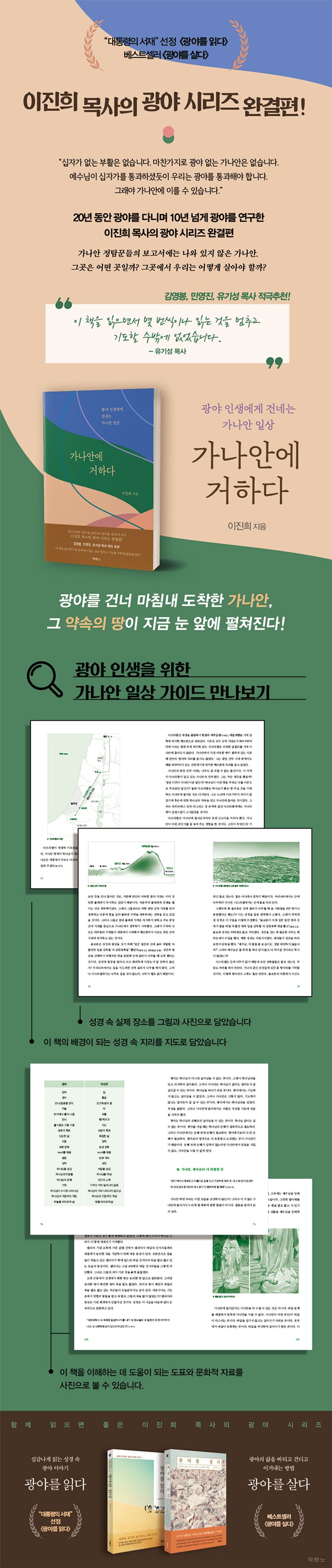 베스트셀러 《광야를 읽다》와 《광야를 살다》를 통해 성경 속에 나타난 광야를 역사적, 지리적, 문화적으로 해석해 주었던 저자가 마침내 광야를 벗어나 약속의 땅, 가나안에 대해 이야기한다. 아브라함에게 약속한 땅, 과연 그곳은 젖과 꿀이 흐르는 비옥한 땅이었을까? 나일 강의 풍요를 누렸던 모세가 느보 산에 올라가 광야밖에 보이지 않는 가나안을 바라보며 무슨 생각을 했을까? 요셉은 왜 그토록 자신의 유골이라도 가나안에 가져가 달라고 했을까? 이 책은 그동안 우리가 머릿속으로 상상했던 가나안에 대해 이야기하지 않는다. 하나님 나라는 물리적 요소를 초월해 영적 세계로 이어져 있기 때문이다. 저자는 광야 시리즈를 완결하며 우리에게 말한다. “십자가 없는 부활은 없다. 마찬가지로 광야 없는 가나안은 없다. 예수님이 십자가를 통과하셨듯이 우리는 광야를 통과해야 한다. 그래야 가나안에 이를 수 있다.”