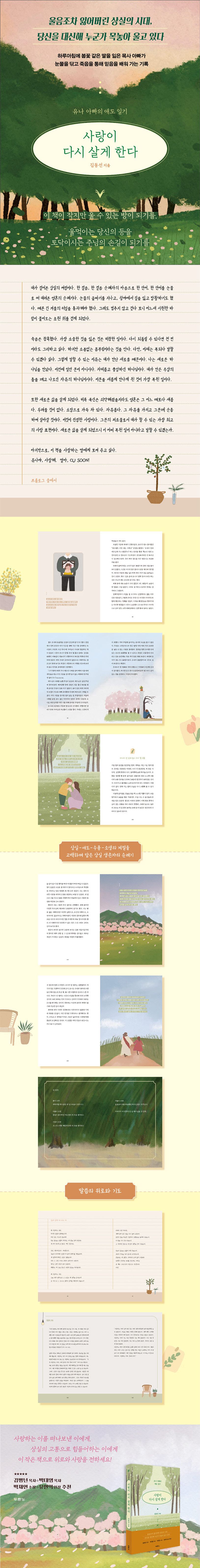 어린 딸아이에게 아무도 모르게 자라고 있던 뇌종양이 어느 날 터졌고, 부랴부랴 달려간 응급실에서 24시간 만에 오빠는 어린 상주가 되었다. 아무리 울어도 해석될 수 없는 불공평한 이 시간들을 저자는 하루하루 기록했다. 처절하다는 말로도 다 못하는 참담한 마음을 토해 내면서 하나님께 묻고, 따지고, 답변을 요구했다. 그 일련의 과정들은 애도의 단계로 이어졌고 저자는 상실, 애도, 수용, 소생의 4단계로 상실의 순례기를 담아냈다.