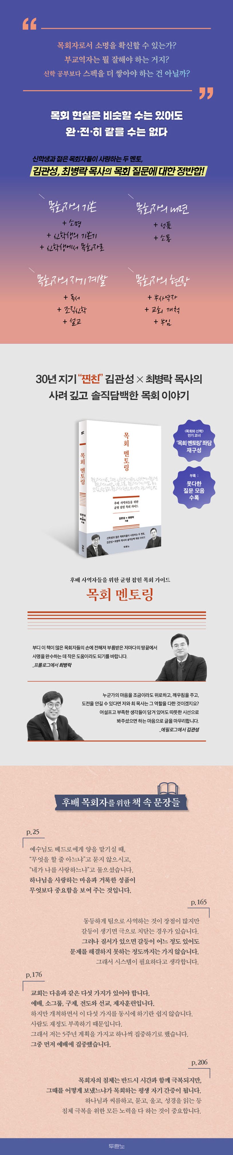 목회자들이 목회 현장에서 고민이 생기면 누구에게 도움을 청할까? 신학생들은 이론과 교회 현실 사이의 충돌을 어떻게 해석해 나갈까? 자신보다 현장 경험이 많은 목회 선배 혹은 몸담고 있는 기관의 선임들일 것이다. 이 책의 공동 저자인 김관성, 최병락 목사는 한국 교회 목회자들 사이에 잘 알려진 “찐친”이다. 목회 소명을 받아 신학생이 되고 담임목회자로 사역하는 지금까지 30년이 넘도록 영적 우정을 나누고 있는 신앙의 동지이다. 이 책은 이 영적 우정에서 출발했다. 하나님을 처음 만나던 시절부터 친구였던 두 사람이 한국 교회의 영향력 있는 목회자들이 되어 나눈 진솔한 목회 이야기이다.
