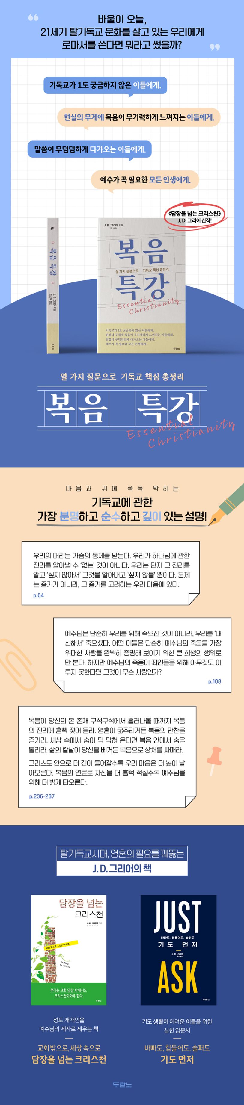 기독교가 1도 궁금하지 않은 이들, 현실의 무게에 복음이 무기력하게 느껴지는 이들, 말씀이 무덤덤하게 다가오는 이들, 예수가 꼭 필요한 모든 인생을 위한 책이 출간되었다. 《담장을 넘는 크리스천》, 《기도 먼저》 등의 책으로 국내에 소개된 J. D. 그리어의 신작, 《복음 특강》. 역사상 가장 영향력 높은 글 중 하나로 손꼽히는 로마서의 궤적을 따라가며 기독교 복음의 핵심을 이해하고 공감하기 쉽게 풀어 냈다.