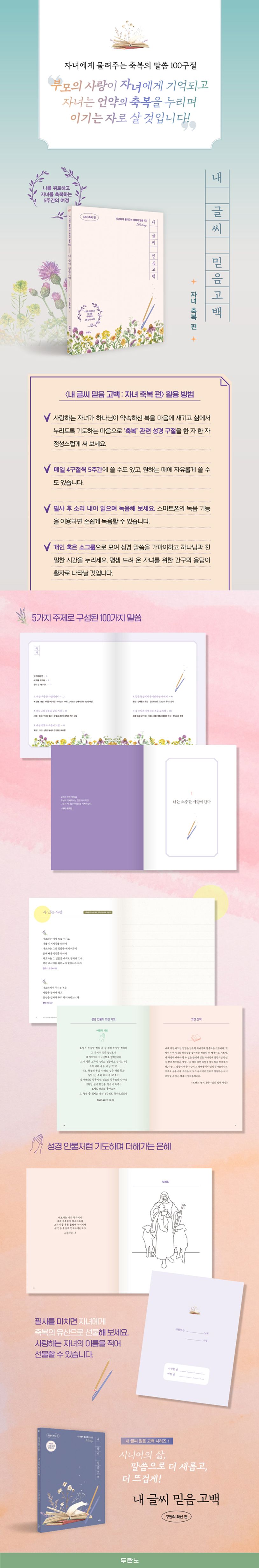 자녀를 사랑하고 축복하길 원하는 노년의 부모를 위한 필사 노트다. 사랑하는 자녀가 하나님이 약속하신 복을 마음에 새기고 삶에서 누리도록 기도하는 마음으로 ‘축복’ 관련 성경 100구절을 '내 글씨'로 쓰도록 구성했다.