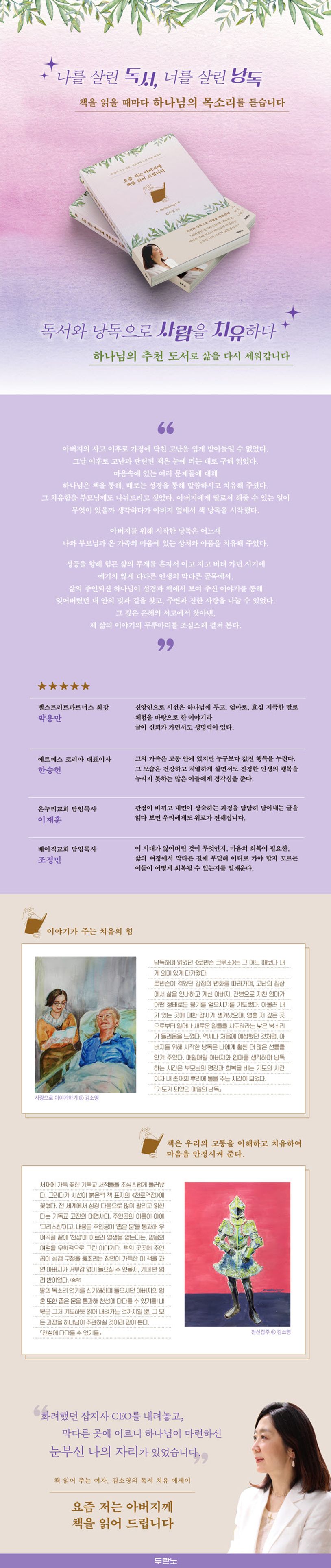 아버지의 사고 이후로 가정에 닥친 고난을 쉽게 받아들일 수 없었던 저자는 그날 이후로 고난과 관련된 책은 눈에 띄는 대로 구해 읽었다. 마음속에 있는 여러 문제들에 대해 하나님은 책을 통해, 때로는 성경을 통해 말씀하시고 치유해 주셨다. 그 치유함을 부모님께도 나눠드리고 싶었다. 아버지에게 딸로서 해줄 수 있는 일이 무엇이 있을까 생각하다가 아버지 옆에서 책 낭독을 시작했다. 아버지를 위해 시작한 낭독은 어느새 저자와, 저자의 부모님과 온 가족의 마음에 있는 상처와 아픔을 치유해 주었다.