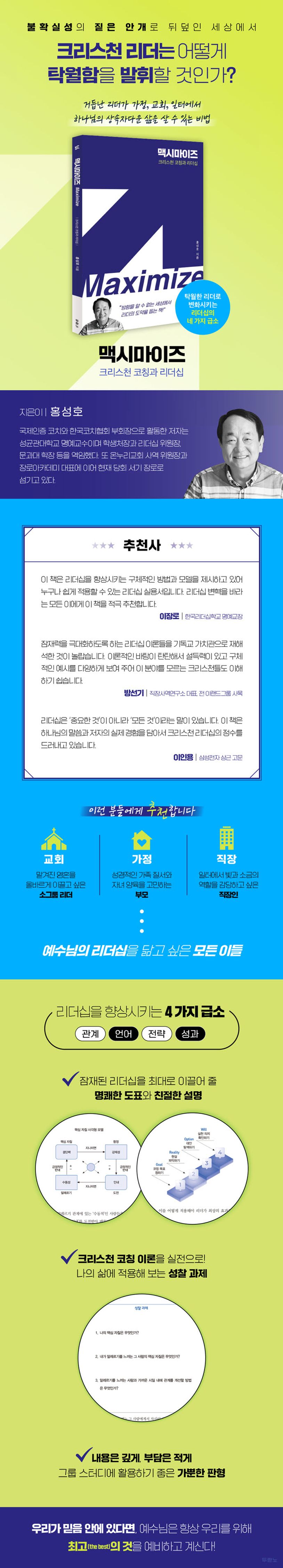 저자는 크리스천 리더가 가정, 교회, 일터 등 삶의 현장에서 하나님의 뜻을 이루며 살기 위해서는 리더의 급소(vital point)를 활성화해야 한다고 말한다. 급소는 잘못되면 치명상을 입지만, 반대로 잘 조절하면 크게 성장할 수 있는 요소다. 저자는 리더십을 크게 향상시키는 급소를 관계, 언어, 전략, 성과 네 가지로 나누어, 각각을 극대화하는(maximize) 실행 모델들을 소개한다.