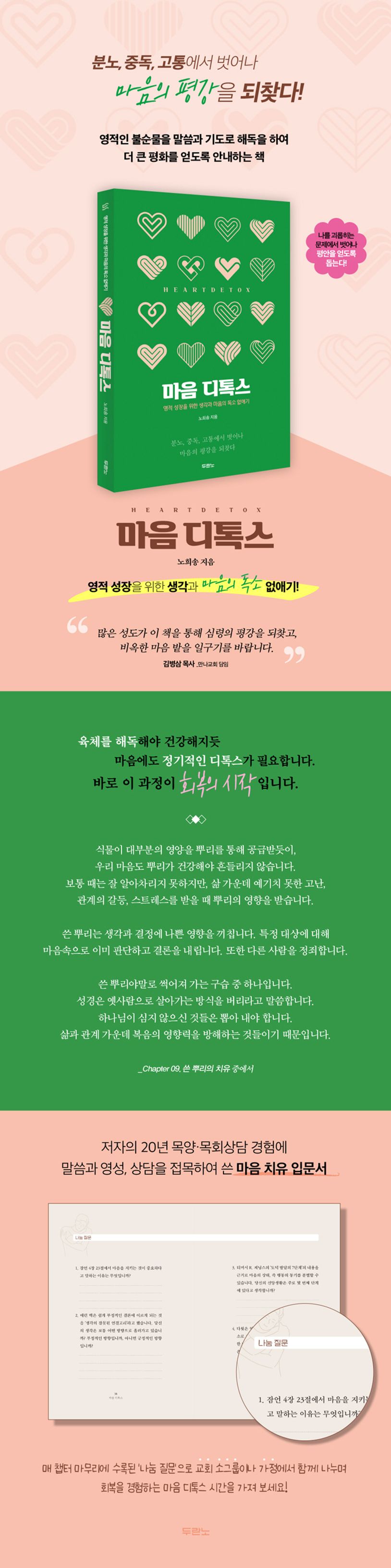 이 책은 저자가 틴데일신학교에서 상담학 교수로 있는 아내와 지난 20년 동안 한 교회에서 목양과 목회상담을 하면서 보고 듣고 배우며 느꼈던 것에 말씀과 영성, 상담을 함께 접목하여 쓴 책이다. 그래서 건강한 마음이라는 주제에 대해 심도 있는 심리학적 이해를 바탕으로 우리 안에 있는 어두움을 직면할 수 있게 하고, 그 어두움 가운데 주저앉은 우리를 빛되신 주님 안에서 일으켜 세워준다. 한 챕터 끝에 수록되어 있는 ‘나눔 질문’으로 교회 소그룹이나 가정에서 함께 나누며 디톡스 과정을 가져 보자. 마음을 열고 자신을 돌아볼 때 반드시 회복과 성장을 경험하게 될 것이다.