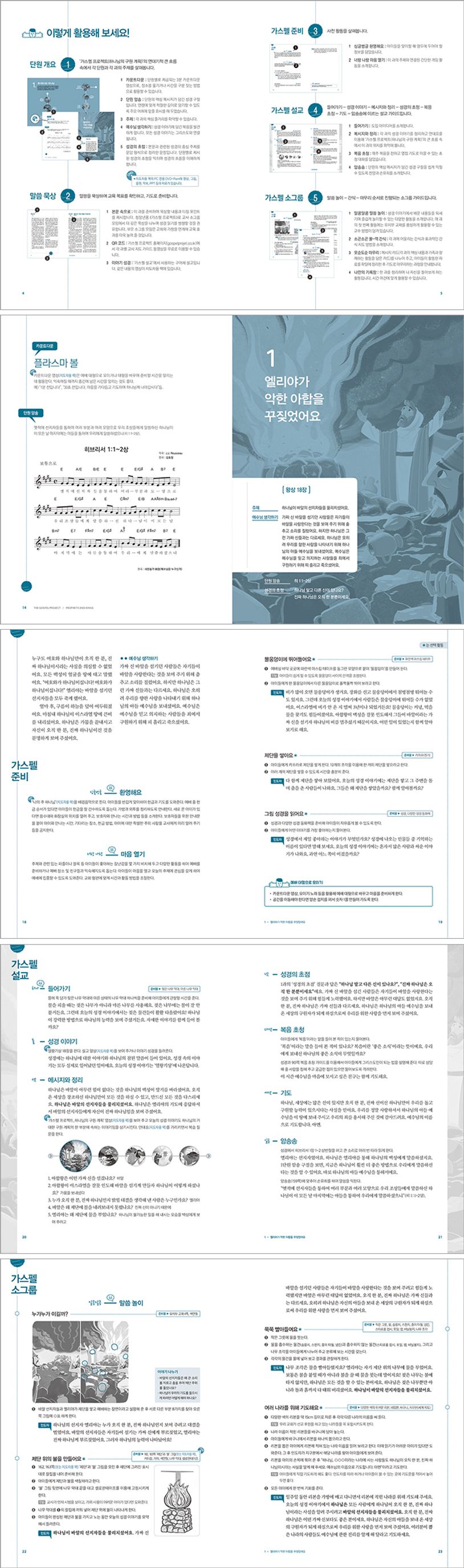 《가스펠 프로젝트》유치부 교사용 교재는 신학적 토대 위에 연대기적 흐름에서 구속사적 관점으로 구성된 《가스펠 프로젝트》 시리즈의 특징을 유아의 눈높이에 맞추어 놀이와 이야기 나누기로 풀어냈다. 유치부 예배의 준비, 설교, 소그룹 과정을 풍성하게 이끌 수 있는 다양한 아이디어를 소개하고 있으며, 특히 교사가 전달해야 할 핵심 메시지를 담은 지문을 통해 경력이 짧은 초보 교사도 효과적인 안전한 지침을 얻을 수 있다. 홈페이지(gospelproject.co.kr)에서 무료로 제공하는 교사 지도 가이드 영상으로 티칭 포인트를 쉽게 익힐 수 있다. 교회 교육과 가정 교육을 연계하도록 부모교육 자료도 제공하고 있다. 이 교재를 통해 유아들은 ‘하나님의 구원 계획’이라는 원대한 흐름으로 성경 전체를 배우게 되므로 하나님 중심으로 생각하는 습관과 복음에 대한 분명한 개념을 정립할 수 있게 된다. 발달과 성장에서 결정적인 시기를 지나고 있는 유아기에 반드시 함께 이루어야 할 영적 성장을 돕는 복음적 교재다.