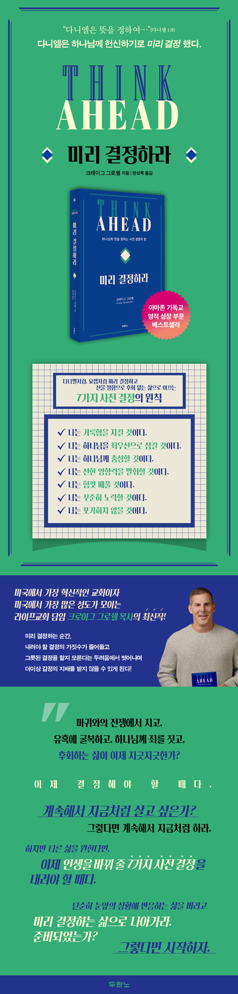 우리는 과거에 한 말이나 행동, 결정을 후회할 때가 많다. 결정해야 할 수많은 문제 앞에서 '어떻게 해야 올바르게 결정할 수 있을까? 이 길을 선택하면 하나님 뜻을 놓치는 것이 아닐까?’라는 생각에 두려워하기도 한다. 우리는 모두 올바른 길을 선택하고 후회 없는 결정을 내리고 싶다. 그런데 왜 우리는 나쁜 선택을 반복하는 걸까? 크레이그 그로쉘은 성경 말씀, 개인적 경험, 인간 행동에 대한 연구를 바탕으로 우리가 하나님 뜻에 합당하면서 우리 자신에게도 유익한 선택을 할 수 있는 원칙을 밝힌다. 하나님이 우리 각자에게 주신 소명은 정말 중요하기에, 중요하지 않은 일을 결정하느라 귀한 인생을 허비할 수는 없다. 이 책은 상황과 감정에 따라 즉흥적으로 결정한 후에 곧 후회하는 악순환에서 벗어나 올바르게 결정하는 방법을 우리에게 제안한다.