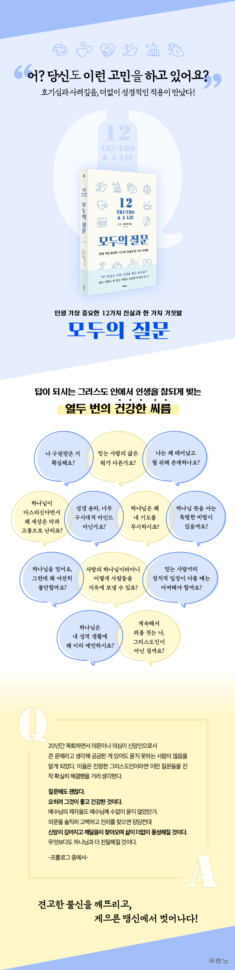 믿는 사람에게나 안 믿는 사람에게나 인생은 물음표로 가득하다. 저자는 목회 현장에서 사람들에게 까다롭고 골치 아픈 질문을 수없이 받아 왔다. 그러다 결국 〈무엇이든 물어보세요〉라는 팟캐스트까지 열게 되었다. “《해리 포터》를 읽어도 되나요?”, “당첨금의 십일조를 교회에 내기로 약속하면 복권을 사도 될까요?” 등 온갖 기발하고 허심탄회한 질문이 매일같이 쏟아졌다. 그런데 저마다 다른 문제로 고심하는 줄 알았건만 막상 뚜껑을 열고 보니 뜻밖에도 다들 같은 문제로 속앓이 중이었다. 그리하여 그동안 가장 많이 받은 12가지 공통 질문을 모아 이 책을 펴냈다.