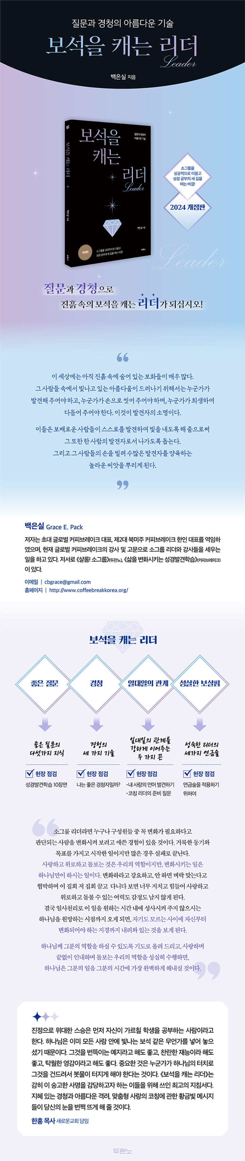 이 책은 10년이 넘는 시간 동안 꾸준히 사랑을 받았던 《보석을 캐는 리더》를 개정한 책이다. 소그룹 리더들에게 생명력 있는 소그룹 인도를 위한 지침서가, 성경 공부 인도자에게 성경 공부의 새 길을 제시하는 ‘성경발견학습교재’가 되어줄 것이다. 나아가 가정의 리더, 교회의 리더인 부모님과 교사에게 성장을 부르는 대화의 기술을 제공한다.