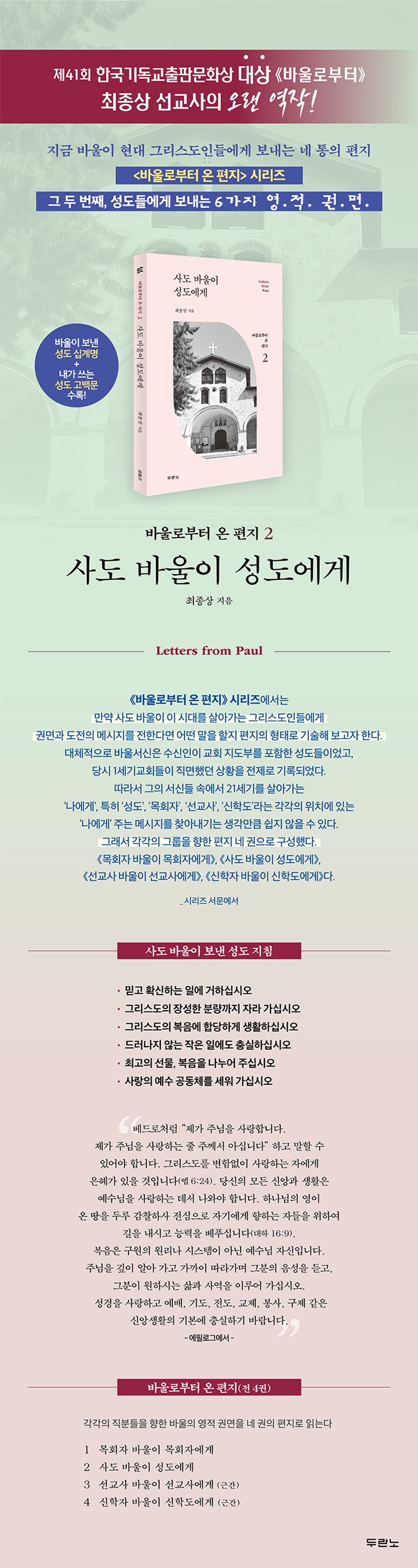 이번 제41회 한국기독교출판문화상 시상식에서도 저자는 “바울 사도는 1인 출판사였다”라고 할 만큼 바울에 대해 천착하고 있다. 해당 행사 설교에서, 저자는 바울이 당시 복음 전도라는 사명을 받고 나서, 핍박이나 위기 속에서도 복음을 말과 글로 전하는 것이 얼마나 절체절명의 과업이었는지를 바울 서신을 통해 역력히 알게 되었다고 설명했다.