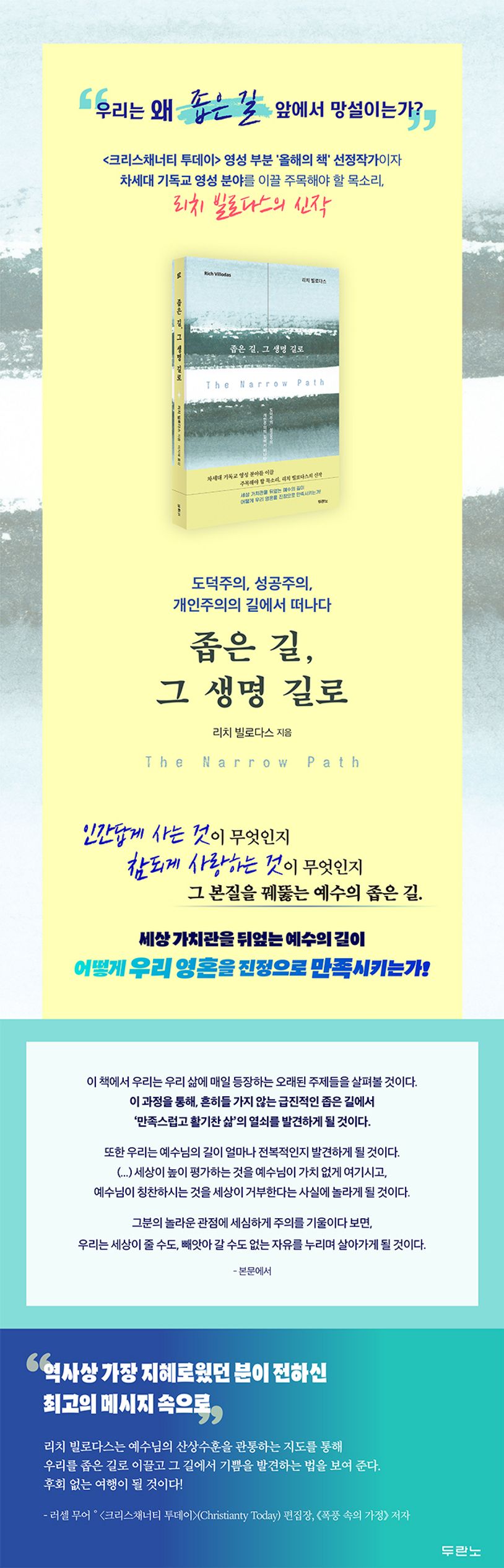《좁은 길, 그 생명 길로》는 잊고 있던 갈림길로 우리를 다시 부른다. 성경, 대중문화, 저자 자신의 실패와 성공담 등 풍부한 자료를 활용해 예수의 좁은 길이 왜 유일하게 가치 있는 삶의 방식인지 설득력 있게 보여 준다. ‘도덕주의, 성공주의, 개인주의’가 빚어낸 현대식 넓은 길을 떠나도록 독려하고, ‘예수님의 좁은 길’에 대한 막연한 거부 반응을 없애 주는 동시에 그 길을 열망하는 마음을 샘솟게 한다. 또한 그 길을 우리 생활 속에서 어떻게 구현할지 구체적인 실천법을 제시한다.