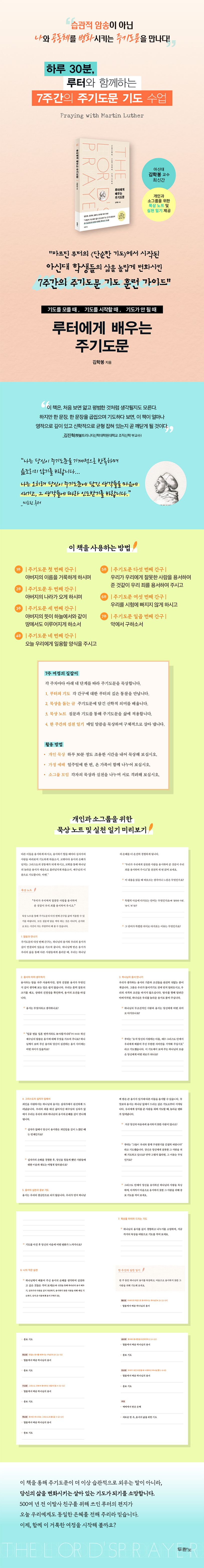 이 책은 김학봉 교수가 이제 막 신학의 여정에 오른 아신대학교 1학년 학생들과 함께 공부한 《단순한 기도》의 내용을 정리한 것으로 주기도문이 습관적인 암송이 아닌 마음을 담은 기도로 드려지길 바라는 마음으로 작성되었다. 주기도문의 내용을 7개로 나누어 7주 동안 루터의 기도를 함께 읽으며 마음으로 고백하고, 묵상을 돕는 글을 통해 삶에 적용하고 실천할 수 있도록 안내한다. 개인이 혼자 할 수도 있지만 주기도문이 ‘나의 기도’가 아닌 ‘우리의 기도’로 고백되어진 것처럼 공동체에서 또 가정에서 함께 한다면 습관처럼 읊었던 주기도문의 한 구절 한 구절이 영혼 깊은 곳에서 뜨거운 울림으로 다가오게 될 것이다.