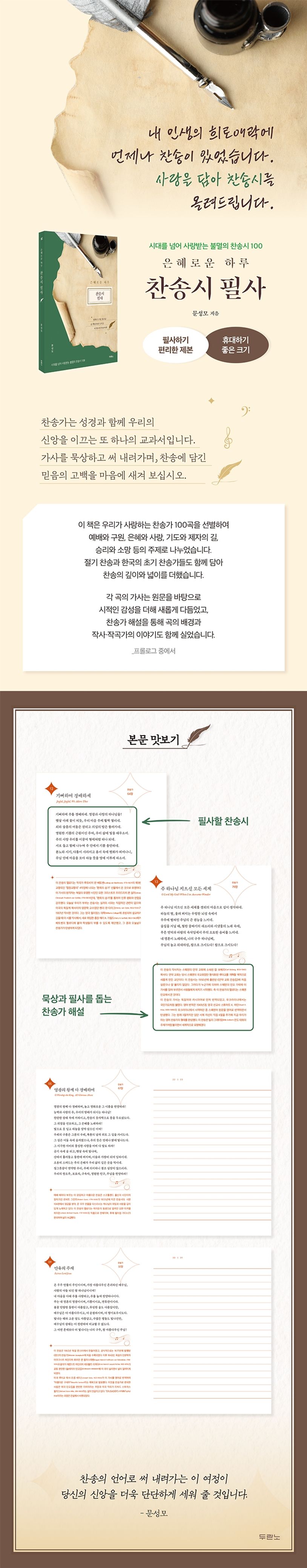 우리가 사랑하는 찬송가 100곡을 선별하여 예배와 구원, 은혜와 사랑, 기도와 제자의 길, 승리와 소망 등의 주제로 나누었습니다. 절기 찬송과 한국의 초기 찬송가들도 함께 담아 찬송의 깊이와 넓이를 더했습니다.