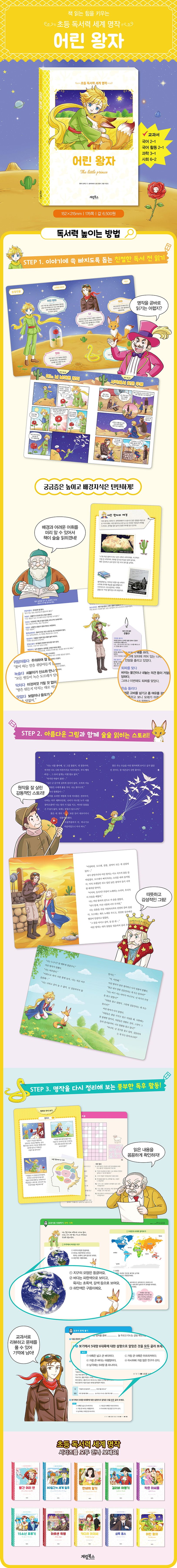 비행기 조종사인 ‘나’는 사고로 사하라 사막에서 한 소년을 만나요. 소년은 소행성 B612호에 살다가 지구로 여행을 온 어린 왕자였죠. 어린 왕자는 정성으로 키우던 장미에게 상처를 받고 자신의 별을 떠나 이웃 별과 지구로 여행을 왔어요. 어린 왕자는 지구에서 여우를 만나고 길들이며 서로에게 세상에 오직 하나밖에 없는 존재가 되어요. ‘가장 중요한 것은 눈에 보이지 않아.’, ‘네가 길들인 것에 대해서는 언제까지나 책임감을 느껴야 해.’ 등 의미 있는 이야기가 가득한 어린 왕자를 초등 독서력 세계 명작으로 만나 보세요.