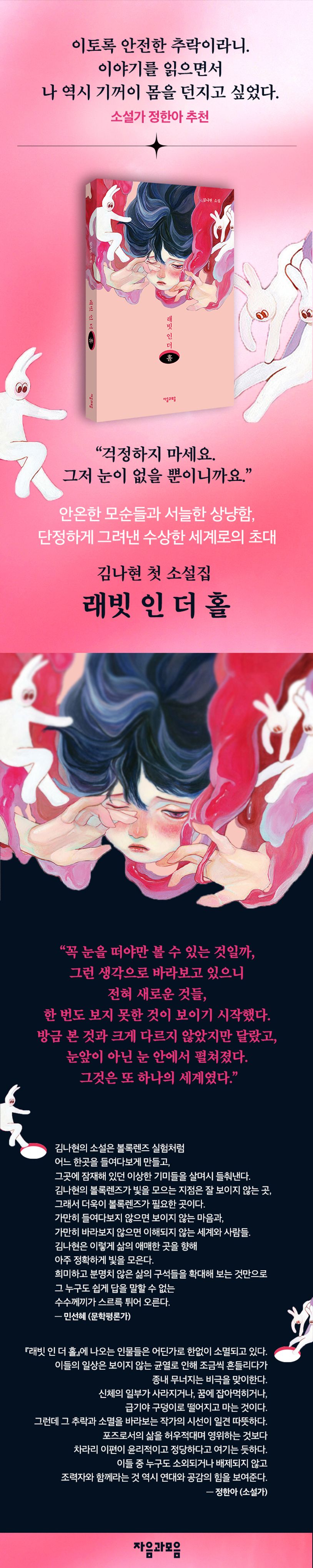 2021년 자음과모음 신인문학상을 통해 소설가로서 첫발을 뗀 김나현이 그간 부지런히 그려낸 일곱 개의 작은 세계를 그러모아 한 권의 세상을 완성했다. 멀리서 보면 안온하기 그지없는 삶을 집요하게 들여다보며 낯설고 서늘한 구석을 기어코 떼어내 각양의 이야기로 발전시키는 작가의 능력은, 사실 그 자체보다 단정하고 차분한 방식과 과정에서 더 빛을 발한다. 그녀가 만든 세계라면 믿을 수 없는 이야기도 어쩐지 믿어봄 직하다고 여겨지는 수수께끼 같은 마법이 이 한 권에 펼쳐져 있다. 우리는 그저 작가가 가리키는 그 세계로, 무한히 확장할 홀 속으로 빨려 들어가기만 하면 된다.