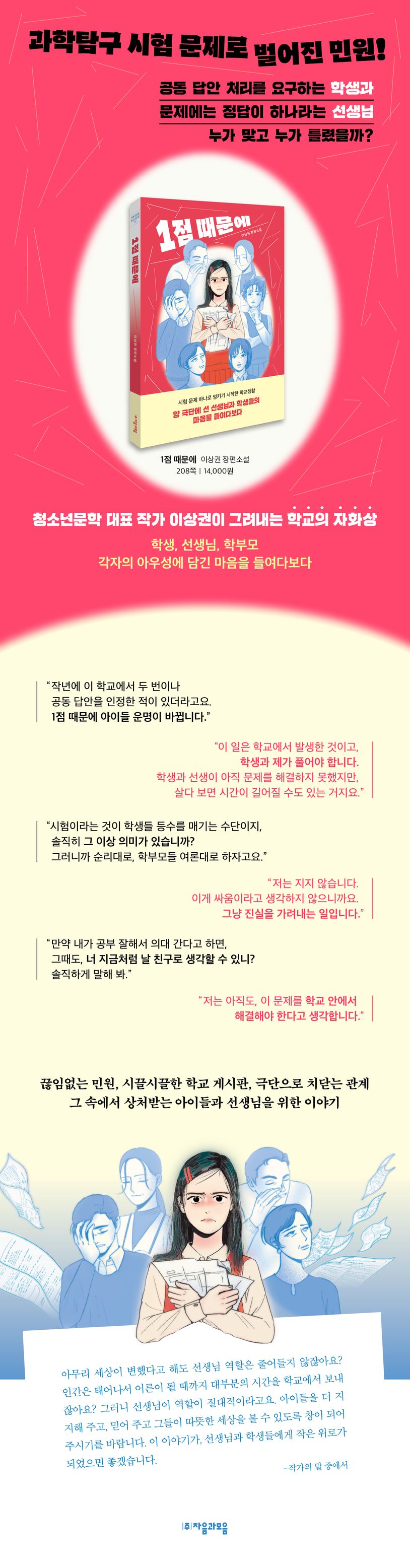 자음과모음 청소년문학 113권, 『1점 때문에』가 출간되었다. 『1점 때문에』는 『하늘로 날아간 집오리』를 비롯해 다수의 청소년소설과 동화를 써낸 청소년문학 대표 작가 이상권의 장편소설로, 한 학교에서 벌어진 시험문제 민원에 대한 이야기를 그려냈다.
