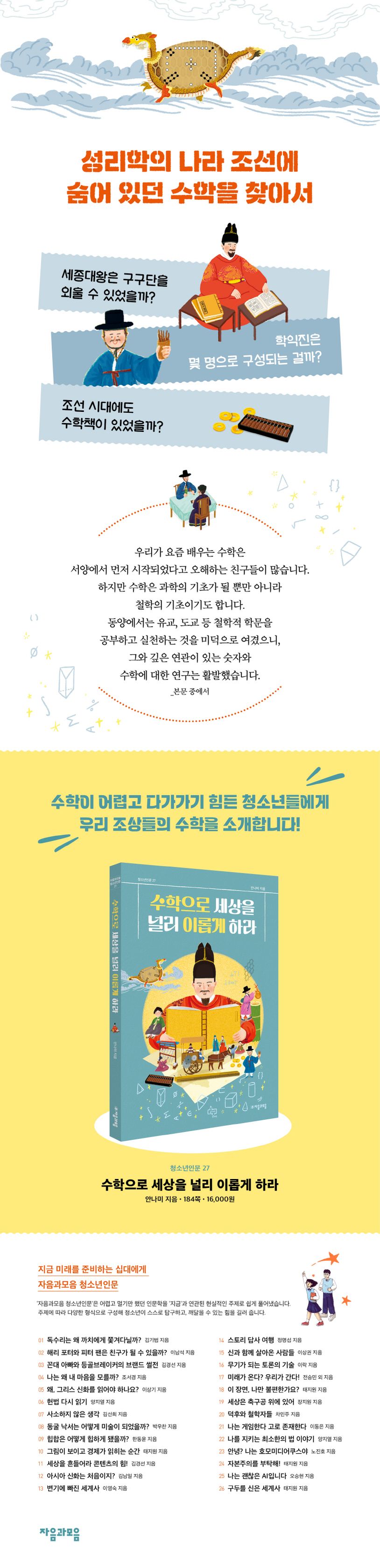 『수학으로 세상을 널리 이롭게 하라』에는 우리가 잘 몰랐던 조선의 수학 이야기가 담겨 있다. 옛 조상들의 수학책을 번역하는 한문학자인 저자가 청소년들을 위해 조선 수학의 역사를 재미있게 소개한다. 과거 동양 사람들이 생각했던 숫자가 가진 의미와 그들의 공부 이야기, 나라를 이롭고 부강하게 만들 수 있었던 수학의 쓸모까지. 이 책을 통해 절대 서양에 뒤처지지 않았던 우리 조상들의 수학적 지혜와 그 근간에 담긴 인문학적 가치를 함께 찾아본다.