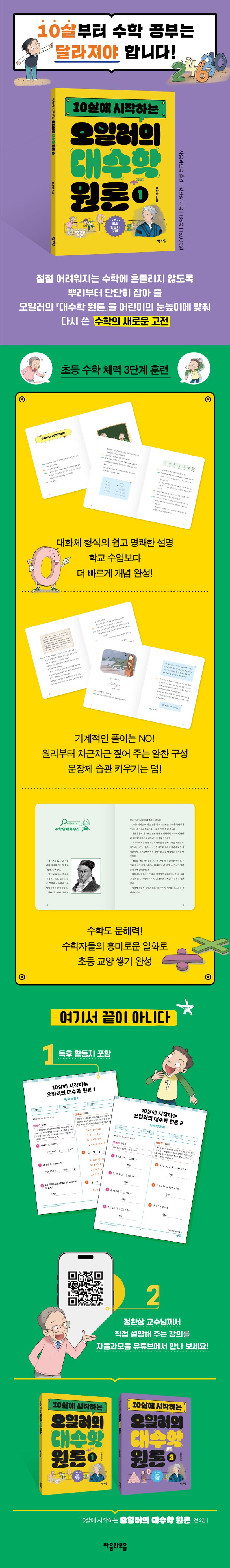 어린이의 눈높이에 맞춰 다시 쓴 『10살에 시작하는 오일러의 대수학 원론』은 점점 어려워지는 수학에 흔들리지 않도록 뿌리부터 단단히 잡아 줄 어린이 수학 설명서다. 공식 암기, 문제 풀이에 머무는 수학 학습이 아니라 사칙연산, 다항식, 교환 법칙과 분배 법칙, 수열의 법칙, 도형수 등을 선생님과 학생의 대화로 차근차근 이해할 수 있게 구성했다. 독후 활동지가 포함되어 있고 자음과모음 유튜브에서 책에 실린 14 강의를 모두 들을 수 있어서 가성비를 따지는 학부모와 어린이도 만족할 것이다.