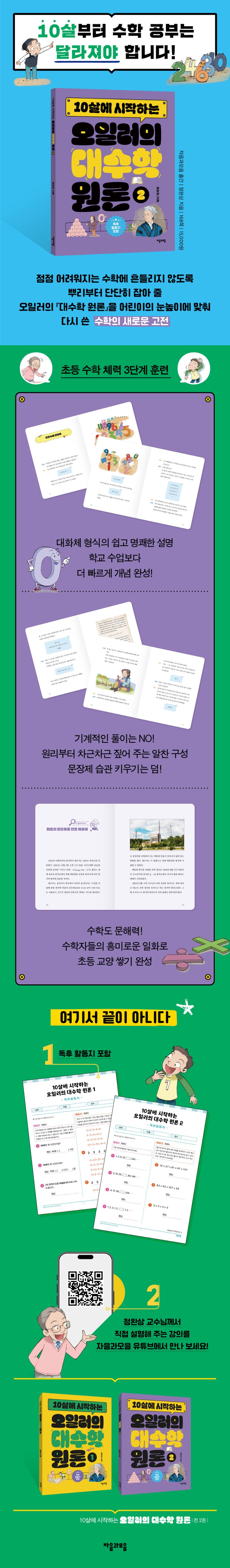 어린이의 눈높이에 맞춰 다시 쓴 『10살에 시작하는 오일러의 대수학 원론』은 점점 어려워지는 수학에 흔들리지 않도록 뿌리부터 단단히 잡아 줄 어린이 수학 설명서다. 공식 암기, 문제 풀이에 머무는 수학 학습이 아니라 교환 법칙과 분배 법칙, 비, 비율과 비례식, 비가 일정한 수열 등을 선생님과 학생의 대화로 차근차근 이해할 수 있게 구성했다. 독후 활동지가 포함되어 있고 자음과모음 유튜브에서 책에 실린 13 강의를 모두 들을 수 있어서 가성비를 따지는 학부모와 어린이도 만족할 것이다.