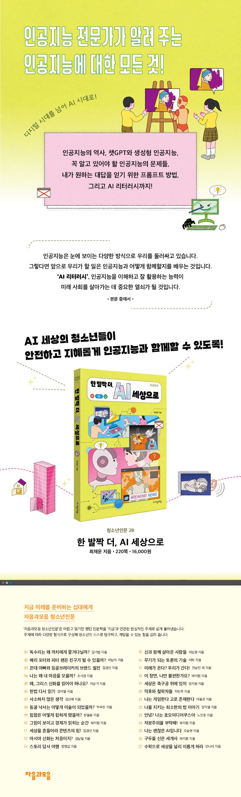 미래를 준비하는 십대에게 들려주는 자음과모음 청소년인문 시리즈의 스물여덟 번째 책, 『한 발짝 더, AI 세상으로』가 출간되었다. 『한 발짝 더, AI 세상으로』에는 AI 시대를 살아갈 청소년들이 반드시 알아야 하는 인공지능에 관한 모든 것이 담겨 있다. 알파고가 이세돌 9단에게 승리한 이후 인공지능은 우리 삶에 빼놓을 수 없는 도구가 되었다. 이 책은 인공지능과 떼려야 뗄 수 없는 시대를 맞이한 청소년들이 안전하고 지혜롭게 인공지능과 함께할 수 있도록 도움을 줄 것이다.