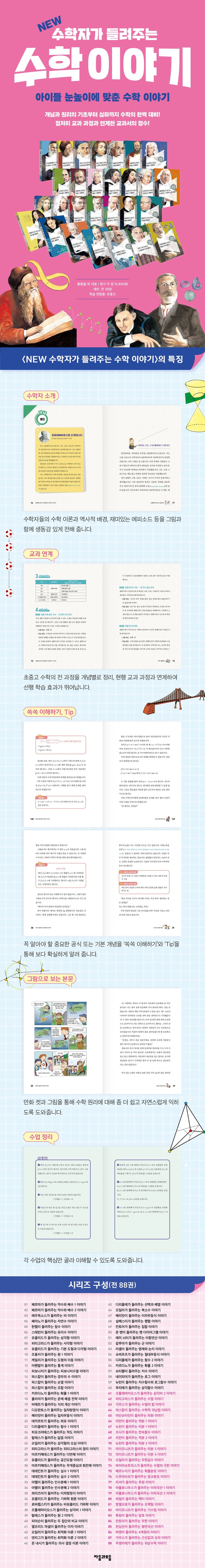 〈NEW 수학자가 들려주는 수학 이야기〉 시리즈 61권부터 88권을 세트로 묶었다. 수학자들이 자신들의 수학 이론과, 그에 대한 역사적인 배경, 재미있는 에피소드 등을 아이들에게 전해 주는 방식으로 수학의 주요 개념과 주제를 설명하는 책이다. 자연수부터 미적분까지 100개로 세분화하여 깊이 있으면서도 재미있게 지식을 습득할 수 있다.
