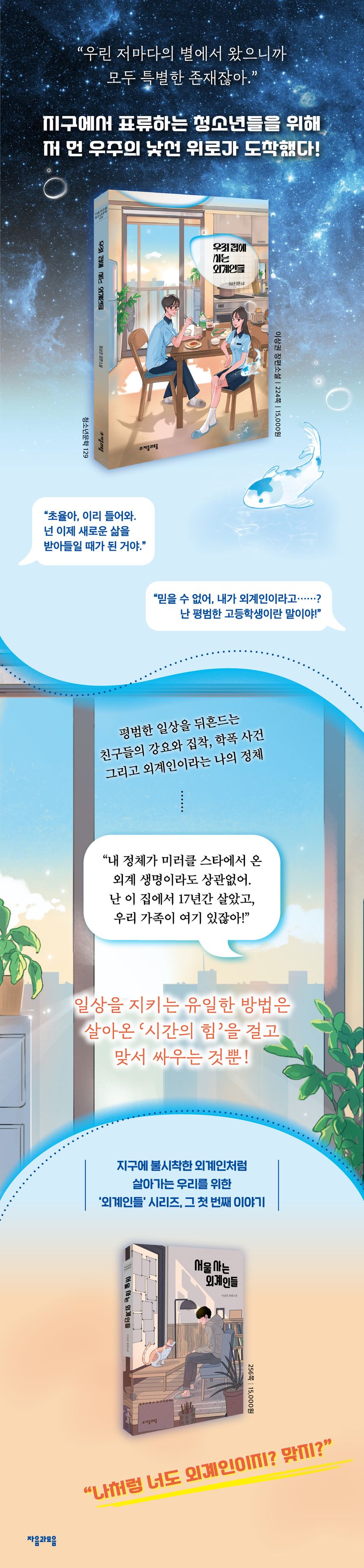 자음과모음 청소년문학 129권 『우리 집에 사는 외계인들』이 출간되었다. 『우리 집에 사는 외계인들』은 이상권 작가의 전작 『서울 사는 외계인들』의 정신적 후속작으로, 청소년의 ‘다름’은 틀린 것이 아니라 저마다의 ‘개성’이자 ‘정체성’이라는 위로를 건넨다.