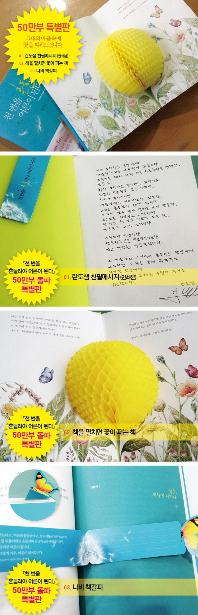 《아프니까 청춘이다》의 저자 김난도가 들려주는 새로운 이야기를 담은 에세이『천 번을 흔들려야 어른이 된다』. 청춘의 불안을 지나 세상 속에서 뜨거운 볕을 맨몸으로 견디며 흔들리고 있는 어른아이들, 어른이라 불리는 이들이 짊어져야 하는 “당신은 어른입니까”라는 질문의 무게에 관해 이야기하는 책이다. 학교를 떠나 사회에 나가 겨우 어른 되기를 시작할 때의 그 흔들림, 사회초년생들이 힘겨워하는 문제와 딜레마 들을 다양한 사례를 통해 보여주고 함께 고민한다. 조금은 흔들려도 괜찮다고, 지금의 흔들림은 지극히 당연한 어른 되기의 여정이라는 위로와 응원의 메시지를 전하며 어른의 흔들림은 자연스러운 것이며, 그러므로 부끄러워하지도 말고 너무 많이 아파하지도 말라는 것, 삶이 나를 거칠게 흔들 땐 꼿꼿이 버티다가 나가떨어지거나 부러지기보단 함께 흔들리며 한 뼘씩 성장하고 새로워지는 것이 진짜 어른이라는 것을 일깨워준다.