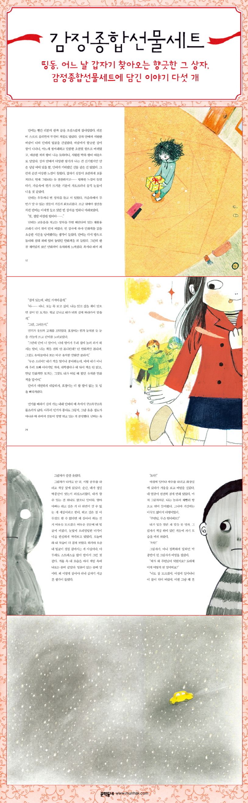 동화작가 김리리의 단편집 『감정종합선물세트』. 자기 내면의 목소리에 귀를 기울이기 시작하는 아이들의 이야기 다섯 편이 수록되어 있는 책이다. 표제작이기도 한 《감정종합선물세트》를 비롯하여 《돼지 공(은)주》, 《대한민국 초딩으로 살아가기》, 《안녕, 쥐방울》, 《연우가 연우에게》를 만날 수 있다. 화가 나오미양은 각각의 이야기마다 어울리는 콘센트를 잡아 다양한 감정의 결을 다채로운 색과 풍으로 완성시켰다.