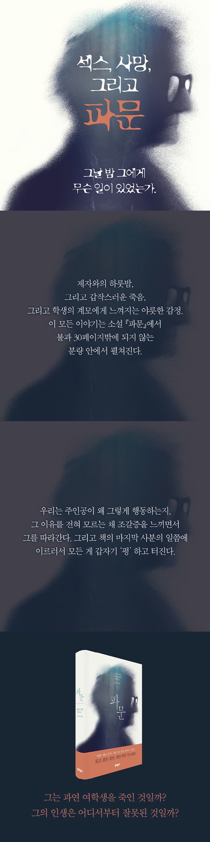 영화 《베티 블루》 《엘르》 원작 작가 필립 지앙의 『파문』. 좋은 작가가 되고 싶었으나 재능 부족을 깨닫고 문학을 가르치는 사람이 된 53세 문예창작학과 교수 마르크. 원하는 대우를 받을 수 없다면 이 일의 장점을 만끽하고자, 그는 그에게 접근해오는 여학생들을 마다하지 않는다. 그날도 마르크는 이름도 모르는 여학생을 집으로 데려와 함께 밤을 보냈다. 그런데 이튿날 새벽, 그녀는 침대 위 싸늘한 시신으로 누워 있다.