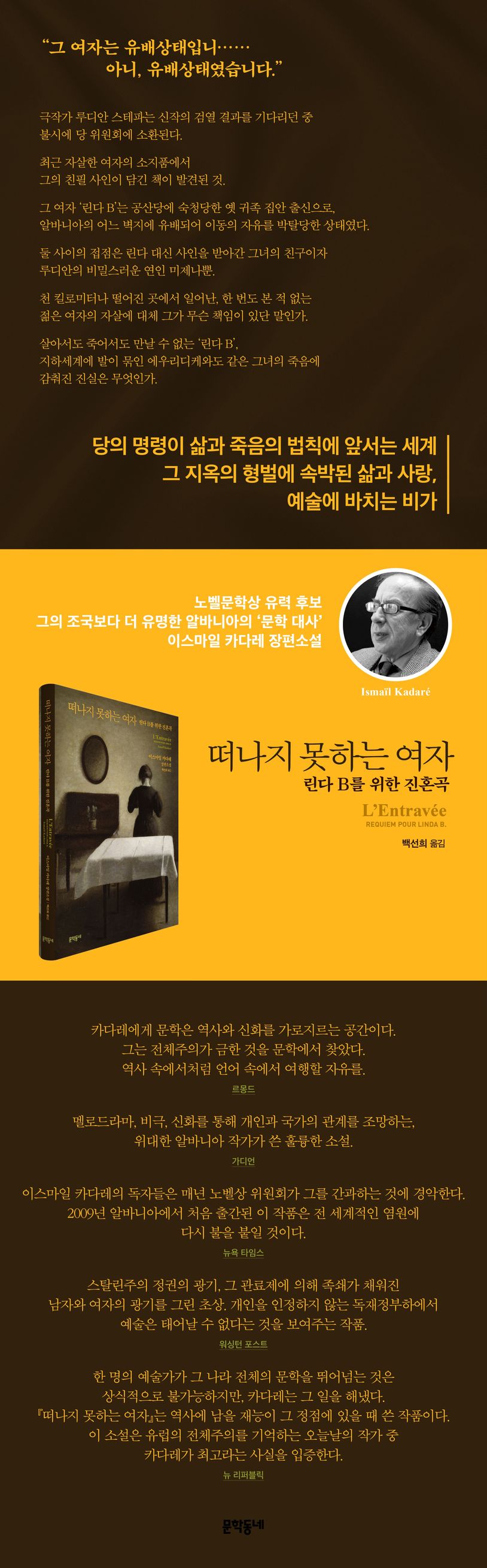 『떠나지 못하는 여자-린다 B를 위한 진혼곡』은 해마다 노벨문학상 유력 후보로 거론되는 알바니아의 ‘문학 대사’ 이스마일 카다레가 2009년 발표한 장편소설로, 공산독재가 한창이던 1980년대 알바니아를 배경으로 어느 여자의 자살에 얽힌 수수께끼와 당의 기준을 충족할 작품 창작으로 고뇌하는 극작가를 통해 전체주의적 감시하의 삶과 사랑, 예술을 그린 작품이다.