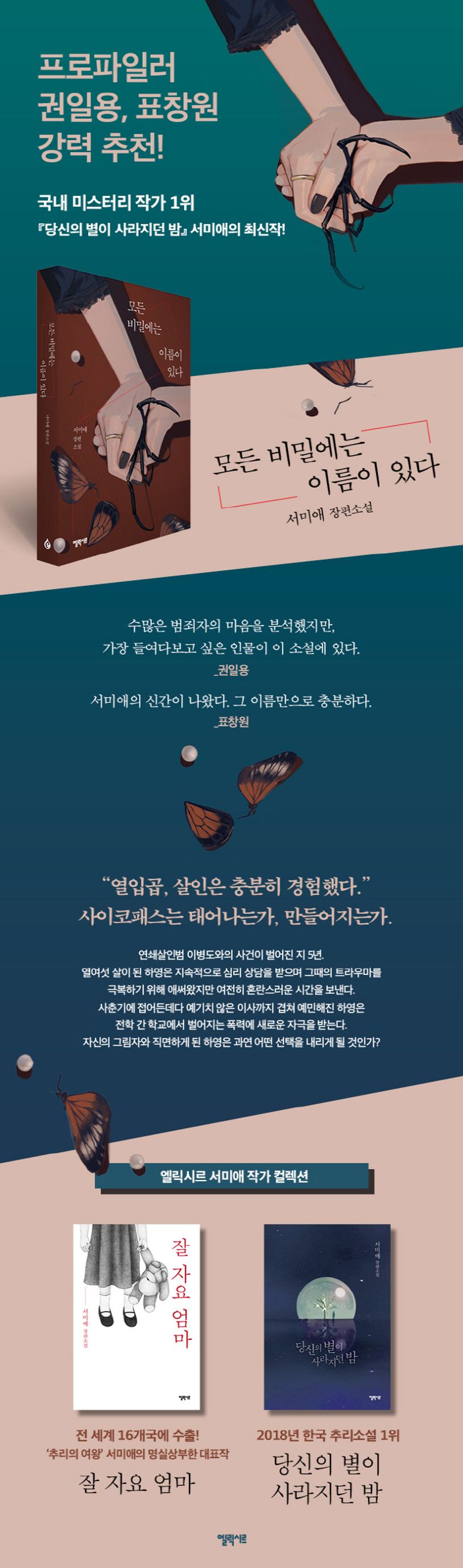 『모든 비밀에는 이름이 있다』는 『잘 자요 엄마』의 후속작이다. 전작에서 열한 살 하영을 중심에 두고 ‘사이코패스는 태어나는가, 만들어지는가’라는 질문을 던진 것으로 이야기를 시작했다면 이번 작품에서는 ‘하영은 그 뒤로 어떻게 되었을까? 어떻게 성장했을까?’라는 질문에 답을 내놓는다. 이제 열여섯 살이 되어 사춘기에 접어든 하영은 변해가는 주변 환경에 흔들리며 자신의 정체성에도 의심을 품기 시작한다. 더 어렸을 때는 깨닫지 못하던 것을 깨닫고, 내부의 자극이 아닌 외부의 자극에 반응하며 끊임없이 고민한다. 이런 모습들은 하영이 과연 어떤 선택을 할지 이야기에 몰입하게 만든다.