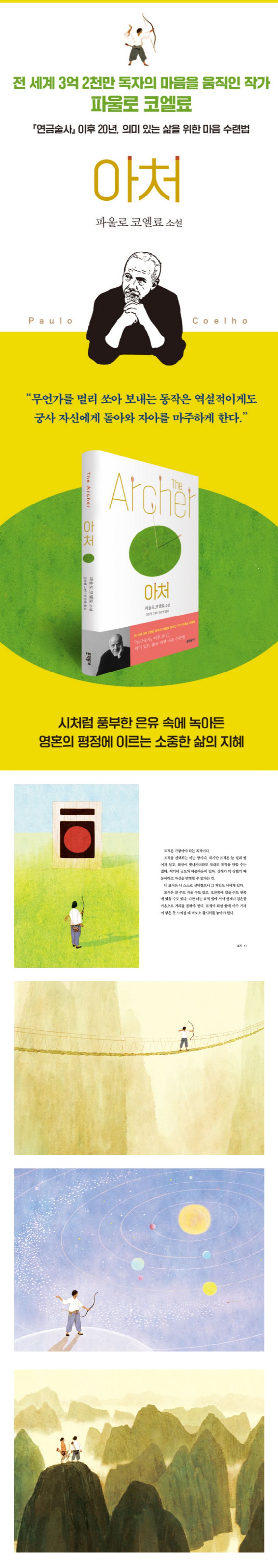 전 세계 수많은 독자들의 ‘인생 책’으로 손꼽히며 “기막히게 멋진 영혼의 모험”을 그려낸 『연금술사』의 한국어판 출간 20주년이 되는 2021년, 파울로 코엘료는 8월 11일 출간되는 『아처The Archer』로 또한번 한국 독자들의 마음을 움직인다. 『아처』는 전설적인 궁사 ‘진’이 그에게 도전해온 이방인과 대결을 펼치고, 그 과정을 지켜보던 소년에게 활쏘기의 기본기를 전수하는 소박하고 단순한 이야기를 담고 있다. 하지만 궁술에 관한 이야기만은 아니다. 혜안을 가진 독자라면 시처럼 풍부한 은유 속에 담긴 인생의 지혜, 의미 있는 삶을 위한 마음가짐에 대한 메시지를 읽어낼 수 있을 것이다. 포르투갈어 원작 텍스트의 여운과 감동을 배가하기 위해 한국어판에는 『엄마 마중』 『책과 노니는 집』 등으로 유명한 화가 김동성의 그림 스물두 점을 함께 실었다.