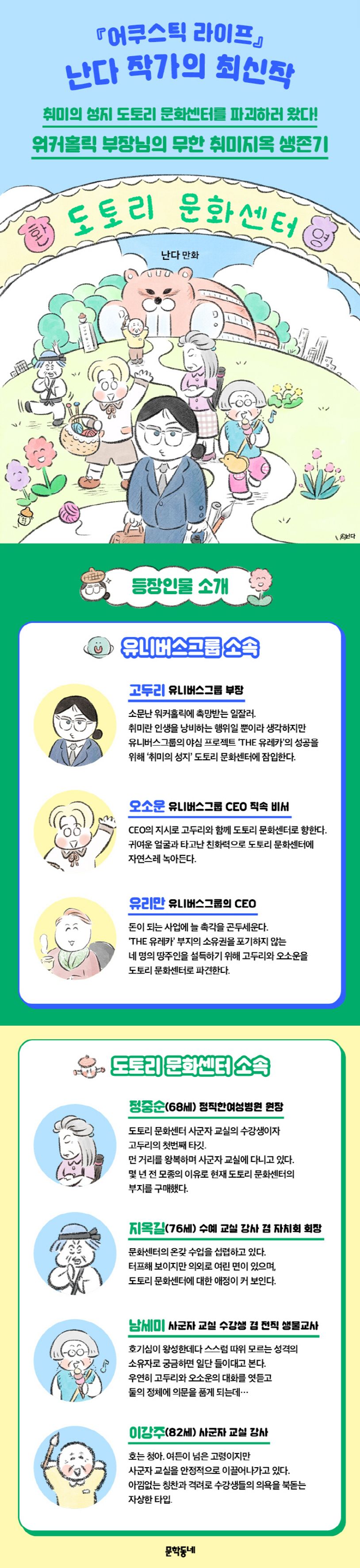 취미의 성지 ‘도토리 문화센터’를 파괴하러 온 부장님과 어쩌다보니 그곳을 지키게 된, 살짝 이상하고 재미있는 중년들의 이야기. 『어쿠스틱 라이프』 난다 작가의 새 장편 연재작으로, ‘문화센터’라는 평범한 군상의 집합소를 무대로 다양한 휴먼 드라마를 선보인다. 단행본 1권에는 첫번째 에피소드인 ‘정중순’의 사연이 펼쳐지며, 단행본만의 부록인 「난다의 구구절절」이 수록되었다.