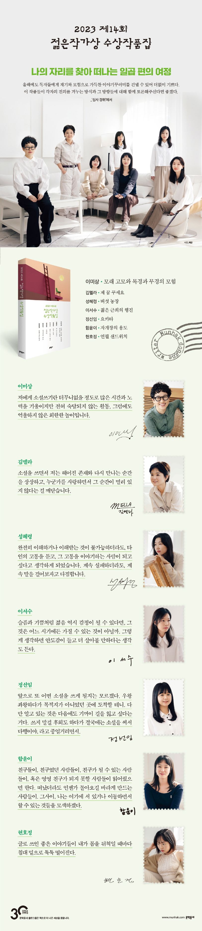 2010년부터 우리 사회의 경향과 징후를 기록하는 매체로서 문학이 지니는 영향력을 믿으며 꾸준히 운영되어온 젊은작가상이 올해로 14회를 맞이했다. 데뷔 십 년 이하 작가들의 중단편소설을 대상으로 하는 젊은작가상은 지난해까지 모두 57명의 새로운 얼굴을 소개하며 독자와 신인 작가를 잇는 교두보로 자리매김했다. 올해 수상자로 이름을 올린 작가는 이미상 김멜라 성혜령 이서수 정선임 함윤이 현호정이다. 데뷔작 「하긴」으로 2019년 젊은작가상을 수상한 이미상이 올해는 심사위원 만장일치로 대상을 거머쥐었고, 한계 없는 상상력으로 읽는 이에게 경쾌한 즐거움을 선사해온 김멜라가 작년에 이어 수상자로 이름을 올리며 저력을 보여주었다. 두 기수상자에 더하여 다섯 명의 작가가 올해 처음 젊은작가상을 수상했다. 새로운 얼굴들을 널리 소개하는 것이 젊은작가상의 취지이니만큼 이들의 전복적인 시선과 한 발짝 앞서 걷는 이야기들이 더욱 뜻깊다. 일곱 편의 수상작은 그 무엇보다 자신의 힘을 믿고 살아가는 이들의 계보를 그린다. 두려워하기도, 흔들리기도, 무너지기도 하지만 스스로를 단단하게 감아쥐어보는 인물들로 깊은 인상을 남기는 이 이야기들은, 이제 막 고립의 시기를 벗어난 우리에게 앞으로 다가올 새로운 풍경을 보여준다.