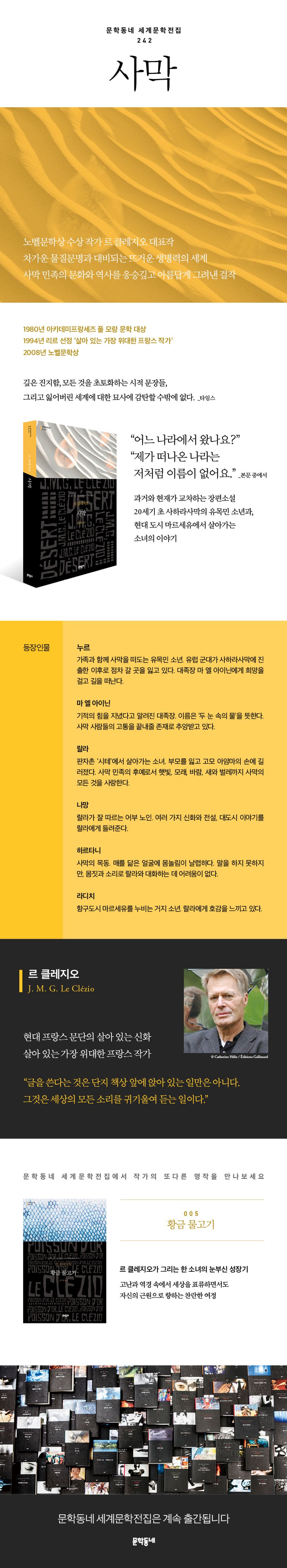 노벨문학상 수상 작가 르 클레지오가 사막 민족의 문화와 역사를 웅숭깊고 아름답게 그려낸 장편소설. 제국주의가 자연세계를 점령해가는 20세기 초 사하라사막의 유목민 소년과, 풍요 속 빈곤이 만연한 현대 도시에서 살아가는 소녀의 이야기가 교차한다. 차가운 물질문명과 대비되는 사막은 뜨거운 생명력의 세계이자, 자연과 신화의 힘이 지배하는 가혹하면서도 신비로운 세계다. 작가의 세계관이 시적 문체에 응축되어 있는 이 작품은 노래처럼 이어지는 사막 민족의 삶의 흐름과, 이에 대비되는 도시 속 불안한 현대인의 삶의 호흡을 보여주며 선명하게 주제를 부각시킨다. 르 클레지오의 『섬』 『성스러운 세 도시』를 번역한 홍상희 번역가가 이전 번역을 새로 다듬어 선보인다.