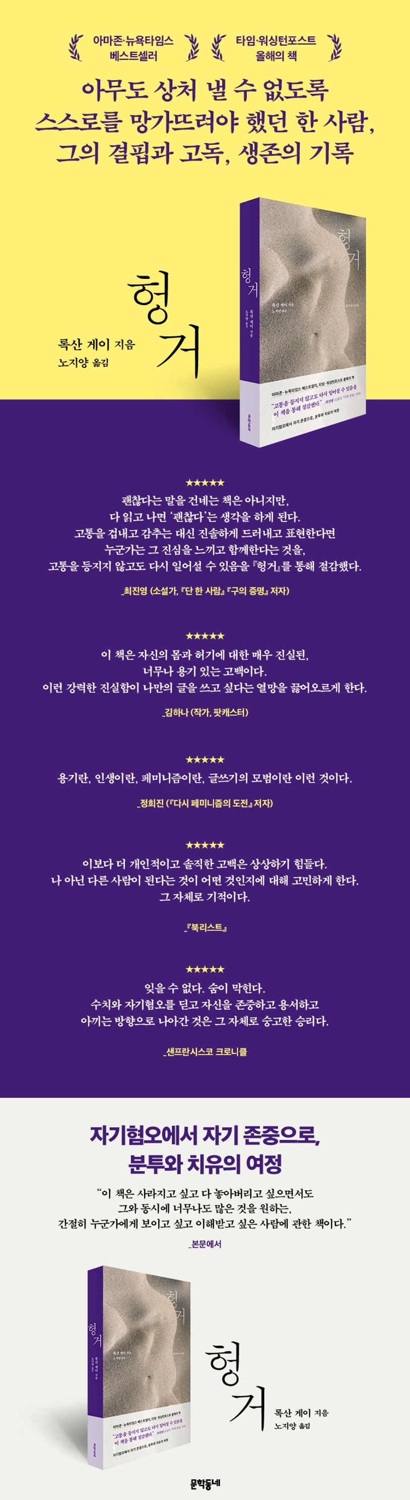 게이는 어린 시절부터 지금까지 자신을 괴롭혀온 한 사건에 대한 기억을 힘겹게 꺼내놓으며 수치심과 외로움이 삶에 미친 영향과 그 상처를 극복하기 위한 여정을 절절하게 고백한다. ‘허기(hunger)’의 본질을 파고드는 내면의 목소리가 생생하다못해 서늘함마저 느끼게 하며 몸과 욕망, 고통에 대한 첨예한 문제의식이 많은 동시대 여성들의 공감을 얻었다. “이런 강력한 진실함이 나만의 글을 쓰고 싶다는 열망을 끓어오르게 한다”는 김하나 작가의 추천사에서 엿볼 수 있듯, 『헝거』는 진실함의 힘을 일깨우며 세기를 거듭해 읽힐 회고록으로 남을 것이 분명하다.