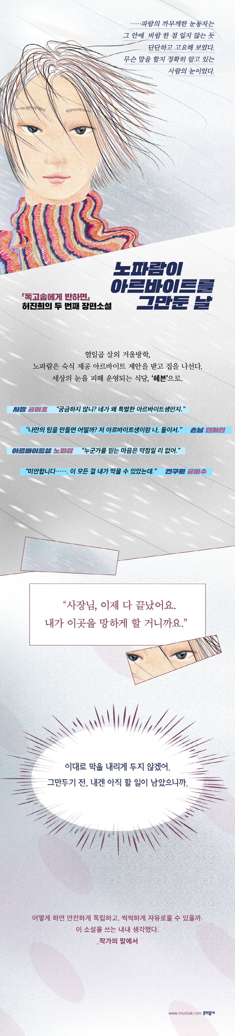 2019년 『독고솜에게 반하면』으로 제10회 문학동네청소년문학상 대상을 받은 허진희 작가가 3년 만에 펴내는 청소년소설이다. 숙식 제공 아르바이트를 하러 수상한 식당에 들어선 노파람이 다시 집에 돌아오기까지의 이야기가 담겼다. 열일곱 살의 겨울방학, 난생처음 가족이란 울타리를 벗어난 노파람이 혼자 마주해야 하는 사람들은 누구 하나 녹록지 않다. 강렬한 매력을 풍기지만 실상은 노파람을 이용하려 덫을 놓고 있는 사람, 노파람에게 호감을 가지고 무작정 다가와 거리를 좁히려는 사람, 노파람을 그저 배경처럼 여기며 무시하는 사람, 도무지 속을 알 수 없는 사람……. 다종다양한 욕망이 들끓는 이곳에서의 시간을 지나 무사히 귀환한 노파람의 손에는 중요한 깨달음이 들려 있다. 사람과 사람 사이의 ‘적당한 거리’는 얼마큼인가 하는 것. 그리고 너무 멀지도 너무 가깝지도 않은 그 거리를 지키기 위해 꼭 필요한 건 ‘믿는 마음’이라는 것.