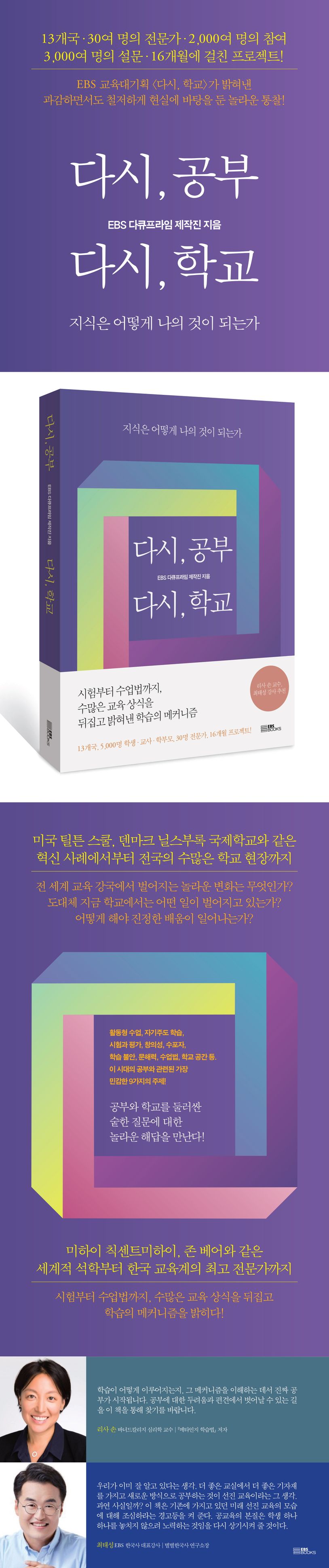 『다시, 공부 다시, 학교』는 13개국, 30여 명의 전문가, 5.000여 명의 교사, 학부모, 학생들이 참여한 교육 프로젝트를 바탕으로, 학습의 메커니즘이 무엇인지를 밝혀낸 책이다. 활동형 수업, 자기주도 학습, 시험과 평가, 창의성, 수포자, 학습 불안, 문해력, 수업법, 학교 공간 등 이 시대 공부와 관련된 가장 민감한 주제 9가지에 대한 새로운 해법을 제시한다. 전 세계 교육 강국에서 벌어지는 놀라운 변화는 무엇인가? 어떻게 해야 진정한 배움이 일어나는가? 대한민국 모든 학생과 교사에게 꼭 필요한 책이 여기에 있다.