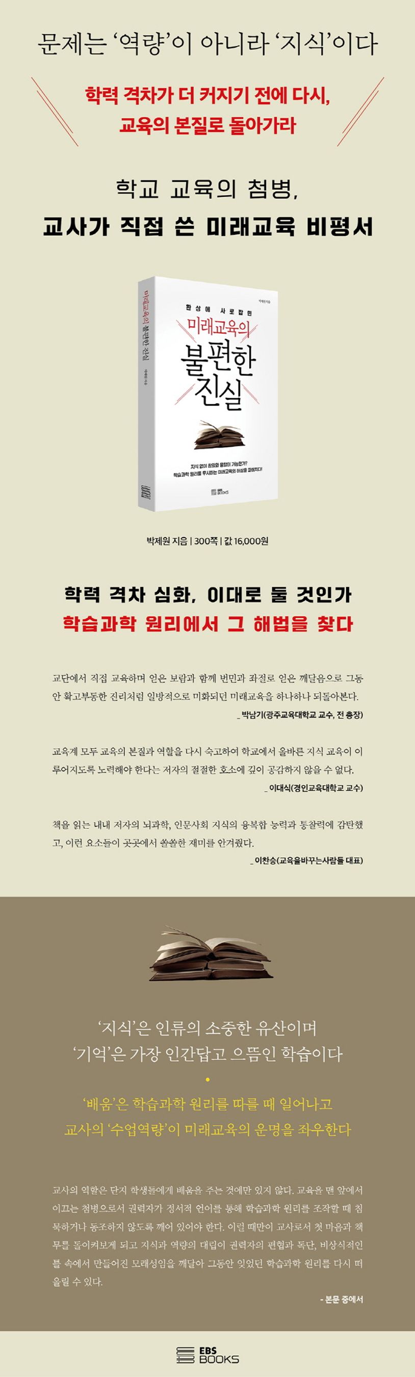 코로나19가 장기화되는 가운데 학교 현장에서 학력 저하, 학력 격차 심화를 우려하는 목소리가 높아졌다. 국내 초·중·고 기초학력 미달 비율이 늘고 특히 중위권이 무너지면서 상위권과 하위권 양극단의 격차가 더욱 벌어져 수업 방식마저 갈피를 잡을 수 없게 됐다. OECD가 실시하는 PISA(국제학업성취도평가) 읽기, 수학, 과학 분야에서도 2012년 이후 우리 학생들의 순위가 계속 하락하는 형편이다. 문제의 심각성을 깨닫고 대책을 마련해야 할 교육당국은 궁색한 변명을 일삼고 여전히 장밋빛 전망만 내세우며 학부모의 불안을 키우고 있다. 학교 교육의 첨병인 현직 교사로서 더 이상 침묵할 수 없었던 저자는 환상과 미신에 사로잡혀 있는 미래교육을 객관적, 실증적으로 비판한다. 코로나19가 학교 교육의 비정상적인 운영을 불러오자 수면 아래 있었던 미래교육의 허상이 드러났다며 이를 계기로 더 늦기 전에 교육의 본질로 돌아갈 것을 호소한다.