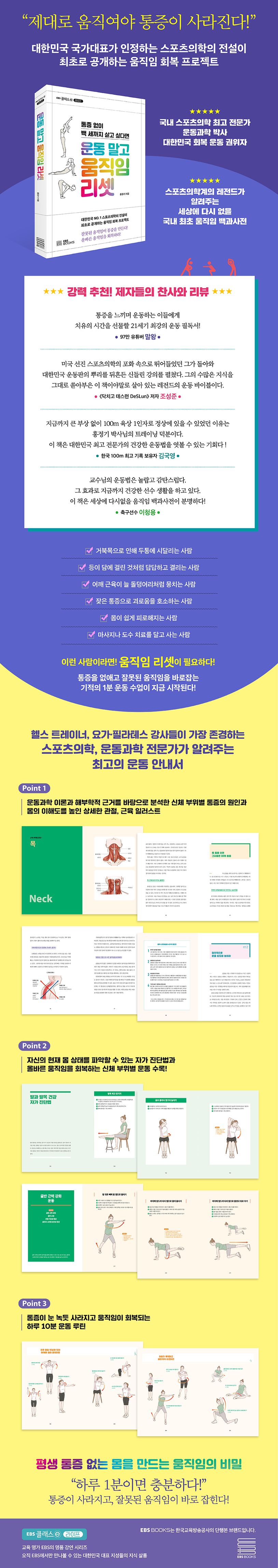 EBS 클래스ⓔ 강연 중 폭발적인 화제를 모았던 〈맨손 통증 치료법〉의 부위별 운동법을 엮은 이 책은 운동하는 이들에게 존경과 찬사를 받고 있는 홍정기 운동과학 박사가 최초로 공개하는 움직임 회복 가이드다. 모든 통증의 원인을 ‘잘못된 움직임’에서 찾은 그는 30년 회복 운동 실전 경험과 운동과학 이론을 바탕으로 통증을 해소하고 바른 움직임을 찾을 수 있는 기적의 운동법을 이 책에 담았다. 해부학적, 과학적 근거를 토대로 신체 부위별 통증의 원인을 분석하고 자신의 현재 몸 상태를 파악할 수 있는 자가 진단법은 물론 올바른 움직임을 회복하는 신체 부위별 운동을 엄선해 수록했다. 또한 신체 부위마다 관절과 뼈, 근육의 위치를 일러스트로 상세히 보여주어 몸에 대한 이해도를 높였다. 잘못 알고 있는 운동 상식과 궁금증을 속 시원히 풀어주며 통증이 나타날 때 따라 하면 바로 효과를 볼 수 있는 하루 10분 운동 루틴도 알차게 실었다.