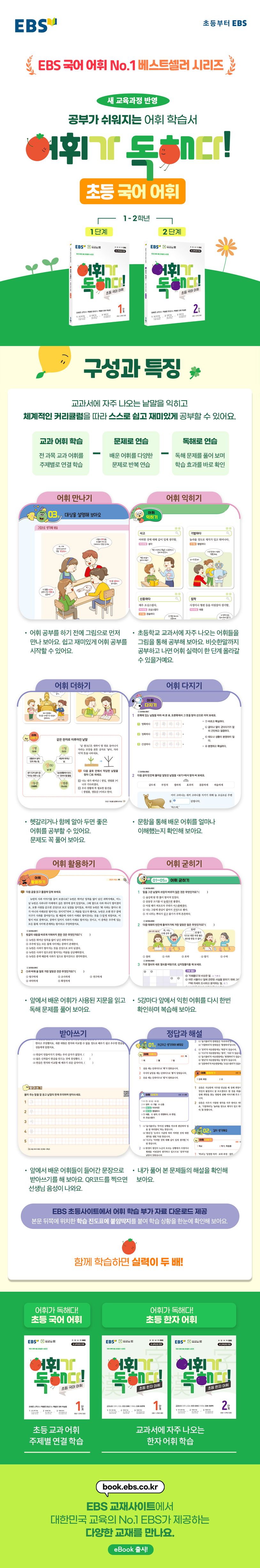 1. 초등학교 1~2학년 교과서에서 자주 나오는 낱말을 수록 -어휘가 어떤 경우에 사용되는지 그림을 통해 익히고, 비슷한말까지 공부하고 나면 어휘 실력이 한 단계 올라갑니다. -헷갈리거나 함께 알아 두면 좋은 어휘를 익힐 수 있습니다.2. 어휘 공부를 통해 ‘읽기’와 ‘국어’ 공부를 한번에 -어휘 익히기에서 공부한 어휘들을 문제로 풀어봅니다. 재미있게 문제를 풀어볼 수 있도록 낱말 퀴즈, 미로 찾기, 만화나 일기의 빈칸 채우기 등의 다양한 문제로 구성하였습니다.