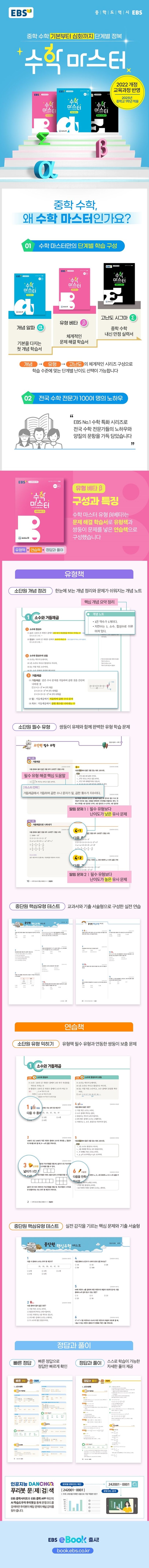 EBS 중학 수학 마스터 시리즈는 체계적인 학습을 위해 개념 α(알파) → 유형 β(베타) → 고난도 Σ(시그마)로 단계를 구성했다. 수학 마스터 유형 β(베타)는 배운 개념을 활용하여 전략적으로 '문제 해결 방법’을 익히는 교재다. 문제의 형태, 풀이 방법에 따라 문제를 유형으로 제시하였고, 유형책과 꼭 닮은 쌍둥이 연습책이 있어 충분한 연습을 추구한다. 기본 개념이 어느 정도 잡혀 있다면 유형 β(베타)로 문제 해결력을 길러 보자.