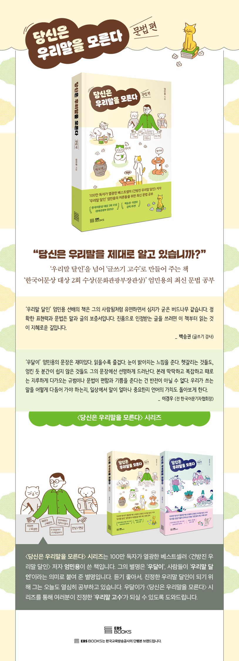 글은 무엇보다 문법에 맞게 쓰는 것이 중요하다. 문장에 있어 문법은 마치 음악의 박자나 음정과 같다. 아무리 좋은 노래라도 부르는 사람이 음정도 틀리고 박자도 못 맞추면, 그것은 노래가 아니라 소음이 되고 만다. 따라서 글을 쓸 때 문법은 ‘꼭 지켜야 할 최소한의 그것’이라고 할 수 있다. 이 책의 저자인 엄민용의 별명은 ‘우달이’, 사람들이 ‘우리말 달인’이라는 뜻으로 붙여 준 별명이다. 〈건방진 우리말 달인〉 시리즈를 통해 많은 독자들에게 ‘우달이’의 존재감을 널리 알렸던 그가 최신 정보를 담아 〈당신은 우리말을 모른다〉 시리즈를 펴냈다. 이 책은 〈당신은 우리말을 모른다〉 ‘어휘 편’과 함께 출간된 〈당신은 우리말을 모른다〉 ‘문법 편’이다.