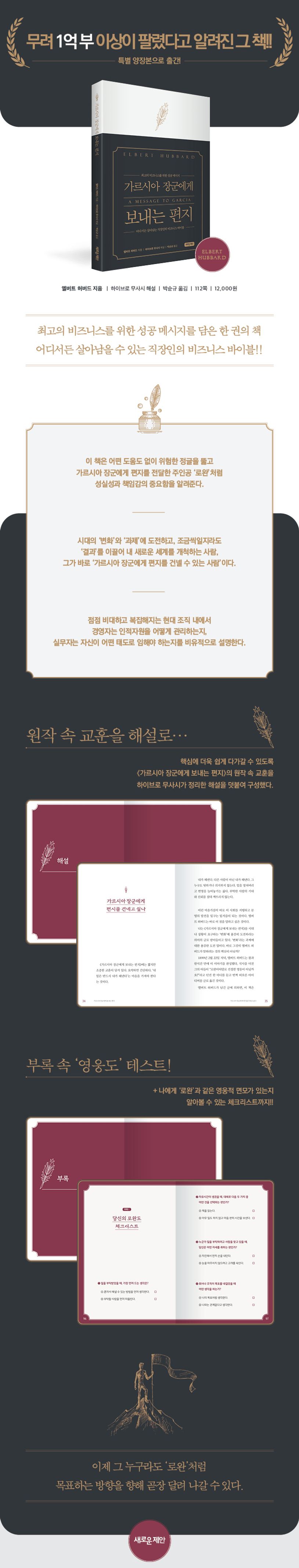 《가르시아 장군에게 보내는 편지》는 100여 년 전에 출간되어 현재까지 무려 1억 부 이상 팔린 세계적인 베스트셀러이다. 미국과 스페인 전쟁 중 영웅적 면모를 보인 ‘로완’ 중위를 통해 한 조직 안의 경영자와 구성원 각자에게 필요한 인적관리 및 자기관리 방법을 비유적으로 소개한다. 원작 속 교훈을 해설자 하이브로 무사시가 정리한 해설을 덧붙여 독자들이 책을 통해 보다 핵심이 더 쉽게 다가갈 수 있도록 구성했다.