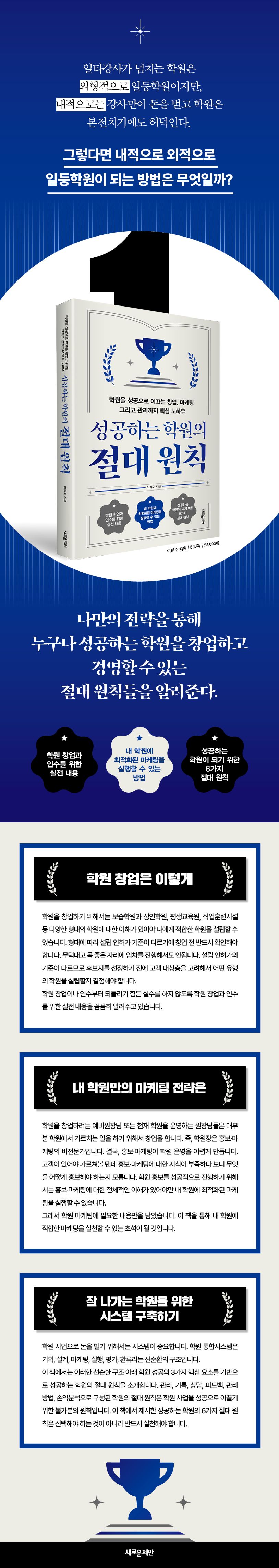 학원사업을성공으로이끄는창업과마케팅그리고관리까지지금이순간에도수없이많은학원이사라지고또생겨나고있습니다.그많은학원들이왜성공하지못하고사라지는걸까요?그이유는학원사업을단순히사람을가르치는일이라고생각하기때문입니다.수강생들만잘가르치는데집중하면된다는학원장들의생각이학원성공을방해하는요인입니다.학원사업의중심이되는핵심요소는‘무형의제품(교육과정)을판다는것’과판매로끝나는것이아닌‘고객을관리하는영업’이라는것입니다.여기에‘지식을판다는것’입니다.사람을가르치기만한다면고객은내학원을찾지않을것입니다.제아무리스타강사가있다고하더라도성공하기쉽지않습니다.성공을위한3가지핵심요소를명확히인식해야합니다.성공하는학원창업이책에서는학원성공을위한3가지핵심요소를바탕으로창업부터마케팅그리고성공하는학원의절대원칙으로구성하였습니다.학원을창업하기위해서는보습학원과성인학원,평생교육원,직업훈련시설등다양한형태의학원에대한이해가있어야나에게적합한학원을설립할수있습니다.형태에따라설립인허가기준이다르기에창업전반드시확인해야합니다.무턱대고목좋은자리에임차를진행해서도안됩니다.설립인허가의기준이다르므로후보지를선정하기전에고객대상층을고려해서어떤유형의학원을설립할지결정해야합니다.학원창업과인수를위한실전내용을꼼꼼히다뤘습니다.내학원만의차별화된마케팅학원을창업하려는예비원장님또는현재학원을운영하는원장님들은대부분학원에서가르치는일을하기위해서창업을합니다.즉,학원장은홍보·마케팅의비전문가입니다.결국,홍보·마케팅이학원운영을어렵게만듭니다.고객이있어야가르쳐볼텐데홍보·마케팅에대한지식이부족하다보니무엇을어떻게홍보해야하는지모릅니다.학원홍보를성공적으로진행하기위해서는홍보·마케팅에대한전체적인이해가있어야합니다.그래야내학원에최적화된마케팅을실행할수있습니다.학원마케팅에필요한내용만을담았습니다.이책을통해모든학원이마케팅을섭렵하고,실천할수는없습니다.그러나적어도내학원에적합한마케팅을실천할수있는초석은될것입니다.성공하는학원을위한시스템구축하기학원을성공으로이끌기위해서는시스템이중요합니다.“잘나가는학원은시스템이다.”라는말이작위적으로들릴수도있지만이것이진리입니다.학원통합시스템은기획?설계?마케팅?실행?평가?환류라는선순환의구조입니다.이책에서는이러한선순환구조아래학원성공의3가지핵심요소를기반으로성공하는학원의절대원칙을소개합니다.관리,기록,상담,피드백,관리방법,손익분석으로구성된성공하는학원의절대원칙은학원사업으로성공하기위한불가분의원칙입니다.이책에서제시한성공하는학원의6가지절대원칙은선택해야하는것이아니라반드시실천해야합니다.이원칙외에도학원을운영하기위해서는수없이많은요소를실천되어야합니다.적어도이책에서제시한6가지원칙은학원성공의마중물이될것입니다.