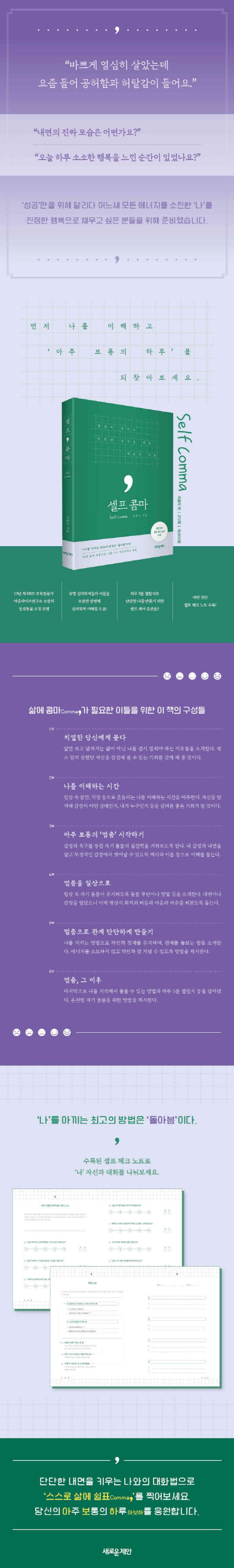 이 책은 단순히 쉬고 비우는 것을 넘어, 삶의 진짜 의미를 발견하고 건강한 나를 만나는 것을 목표로 한다. ‘일상·관계·소통·감정 돌봄’을 통해 자신과 대화하며 나를 알아가는 법을 차근차근 알려줄 것이다. 늘 바쁘게 살아오느라 번아웃과 무기력을 반복하는 모든 이가 『셀프 콤마』를 통해 ‘애쓰지 않아도 괜찮은’, 진짜 ‘나’를 만나 편안해지기를 바란다.